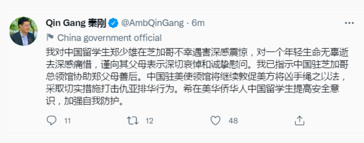 他发推说,他对中国留学生郑少雄在芝加哥不幸遇害深感震惊,对一个年轻生命无辜逝去深感痛惜,谨向其父母表示深切哀悼和诚挚慰问。
