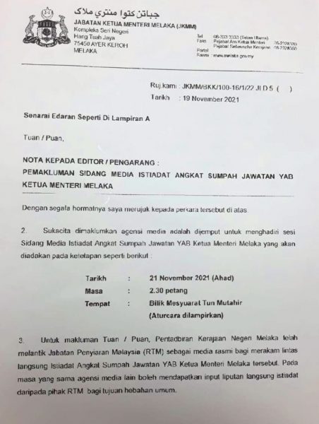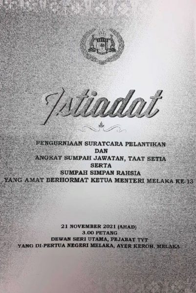 《星洲日报》马六甲办事处今日中午接获甲州首长署机构传来的传真,邀请媒体出席本月21日(星期日)下午2时30分,在甲州政府行政大厦会议室举行的甲首长宣誓典礼新闻发布会。