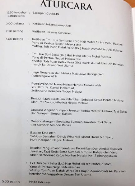 根据邀请函附上的流程表,典礼将从下午3时开始进行,在唱国歌和州歌后,州秘书拿督卡米尔莫哈末将宣读新任首长名字,由甲州元首移交委任状给后者后,再进行宣誓仪式。