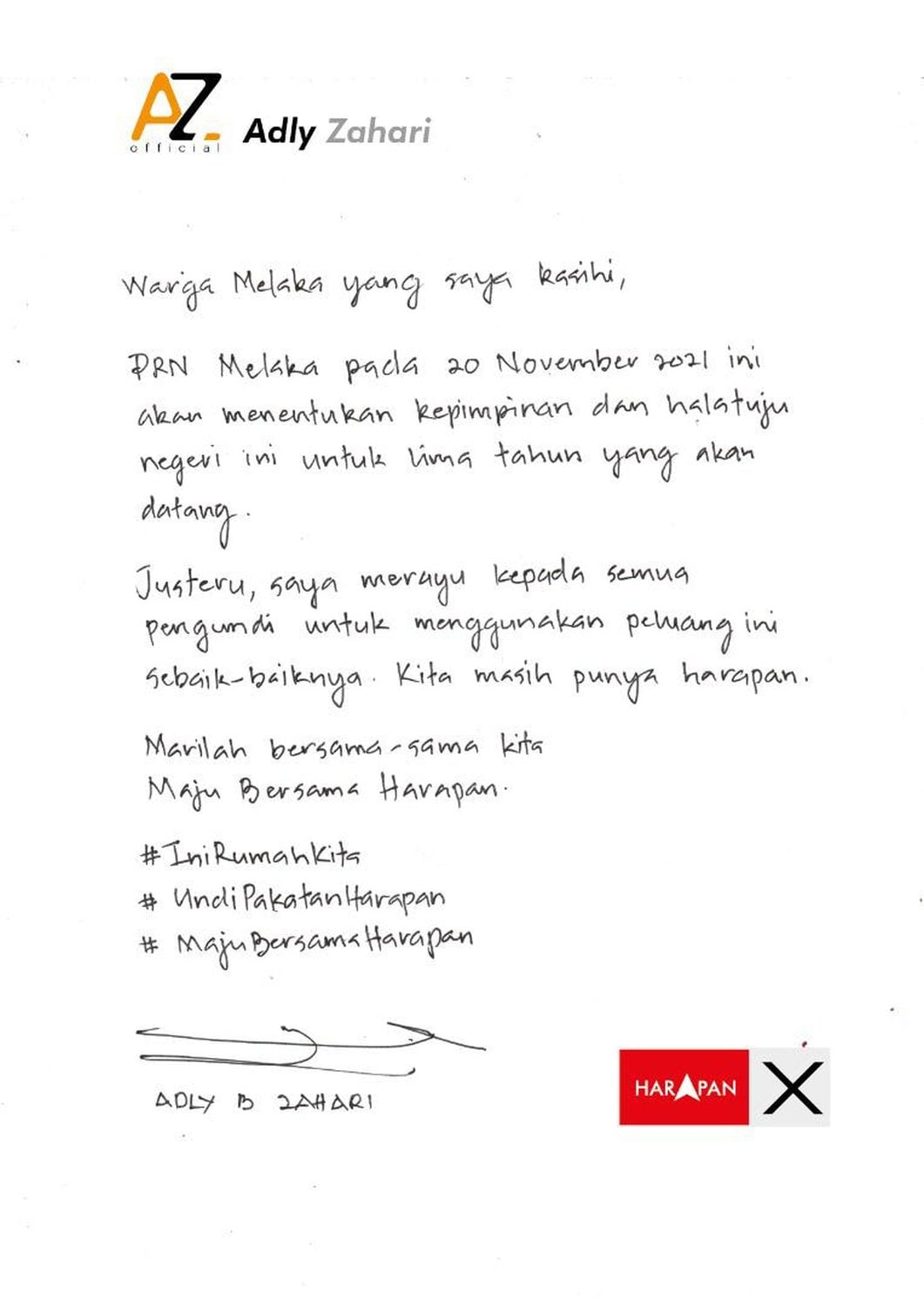 (马六甲19日讯)希盟主席兼武吉卡迪候选人阿德里发出影片,以手写信的方式语重心长告知选民,20日投票日将决定甲州未来5年的方向,因此促请选民好好利用手上的一票。