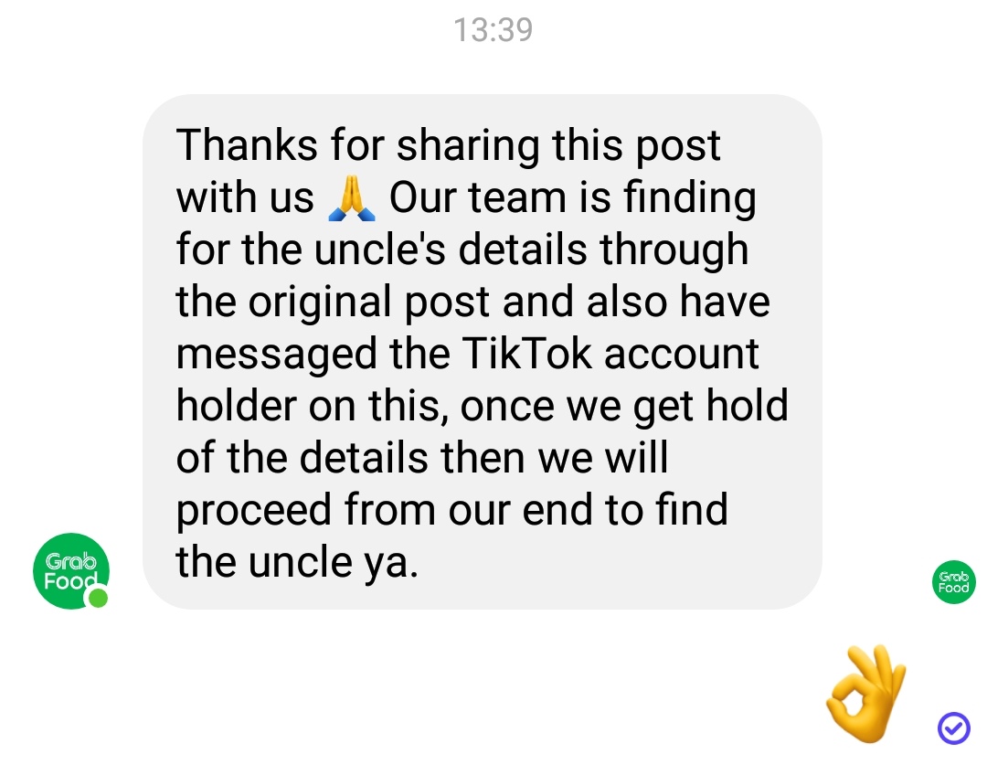该公司旗下GrabFood平台在脸书回复《星洲日报》的信息时说,公司团队已留言给贴主,目前正尝试寻找这名老伯。