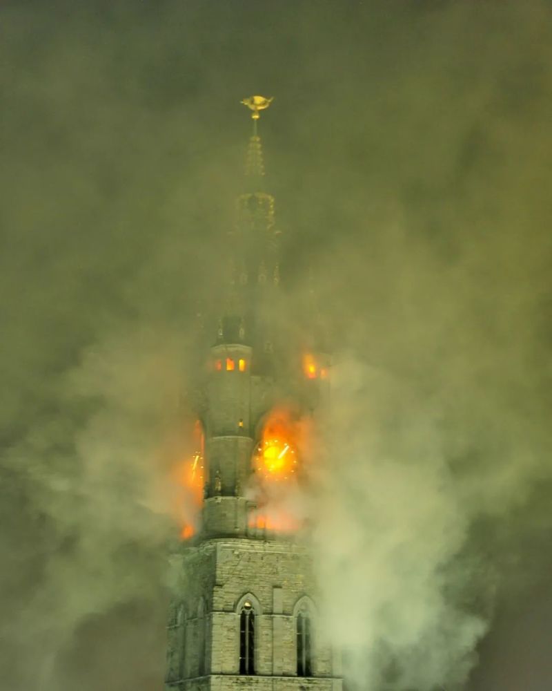 奥地利艺术家Michael Langeder作品,“点燃”了根特三塔之一的钟楼,烟雾和灯光装置制造了这一幕从未发生过的火灾恐怖场景。(取自腾讯网)