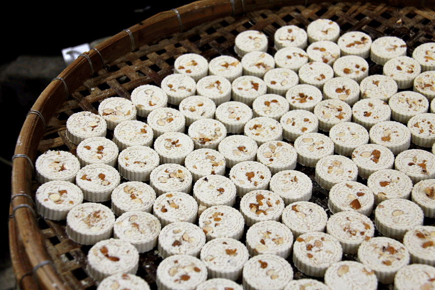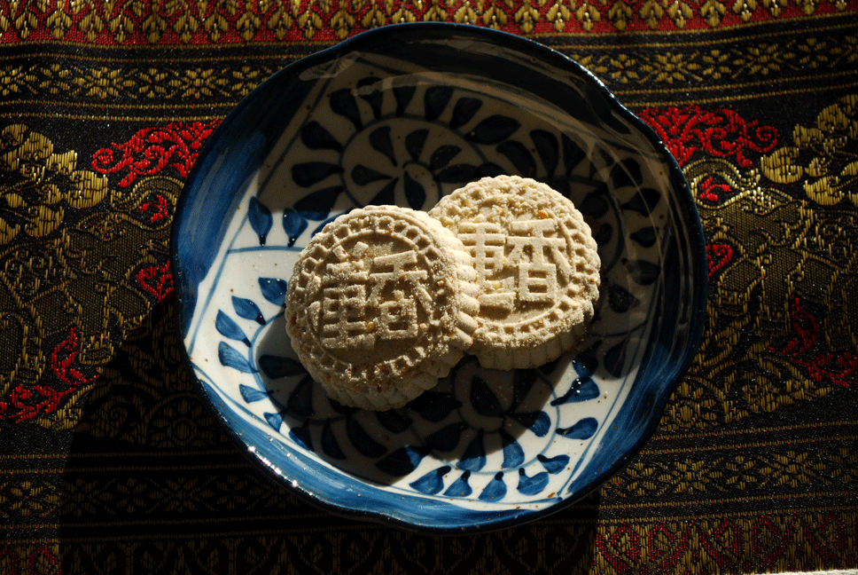 其实,在我童年时候除了炒米饼外,杏仁饼偶尔也会出现在年饼当中,多数是亲友送礼,传了几手后换来的。从广东中山或澳门进口,这些印刷精美、圆桶铁罐装的杏仁饼在当时可是上等年货。然而家人对杏仁的那股“木虱”味并无好感,我人云亦云地跟着闻杏色变,到头来也只有外婆这个“原乡人”懂得欣赏这份来自她故乡的浓浓年味了。
