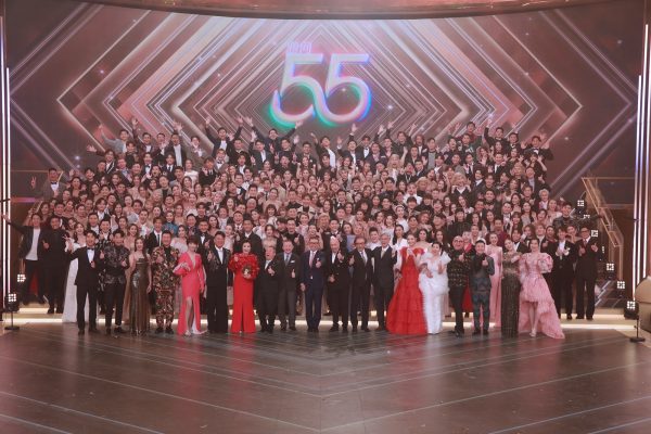 (香港20日讯)无线(TVB)庆祝迈向55周年台庆,昨晚于电视城举行一年一度大秀《万千星辉贺台庆》,动员逾250名艺员及歌星演出,气氛热闹。今年回归TVB出任总经理的曾志伟,联同主席许涛、总经理(商务营运)萧世和一同主持亮灯仪式,曾志伟花心思在发尾剪了“55”字样,相当抢镜。