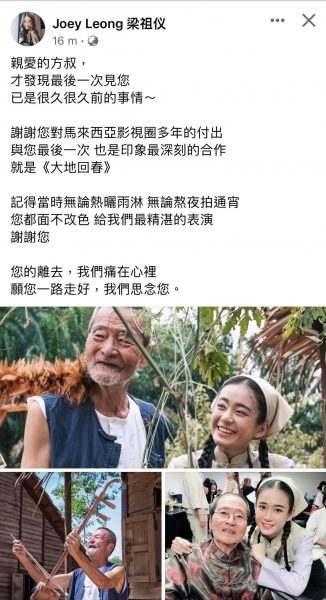 亲爱的方叔,才发现最后一次见您已是很久很久前的事情。谢谢您对马来西亚影视圈多年的付出,与您最后一次也是印象最深刻的合作就是《大地回春》。记得当时无论热晒雨淋,无论熬夜拍通宵,您都面不改色,给我们最精湛的表演,谢谢您。您的离去,我们痛在心里。愿您一路走好,我们思念您。”