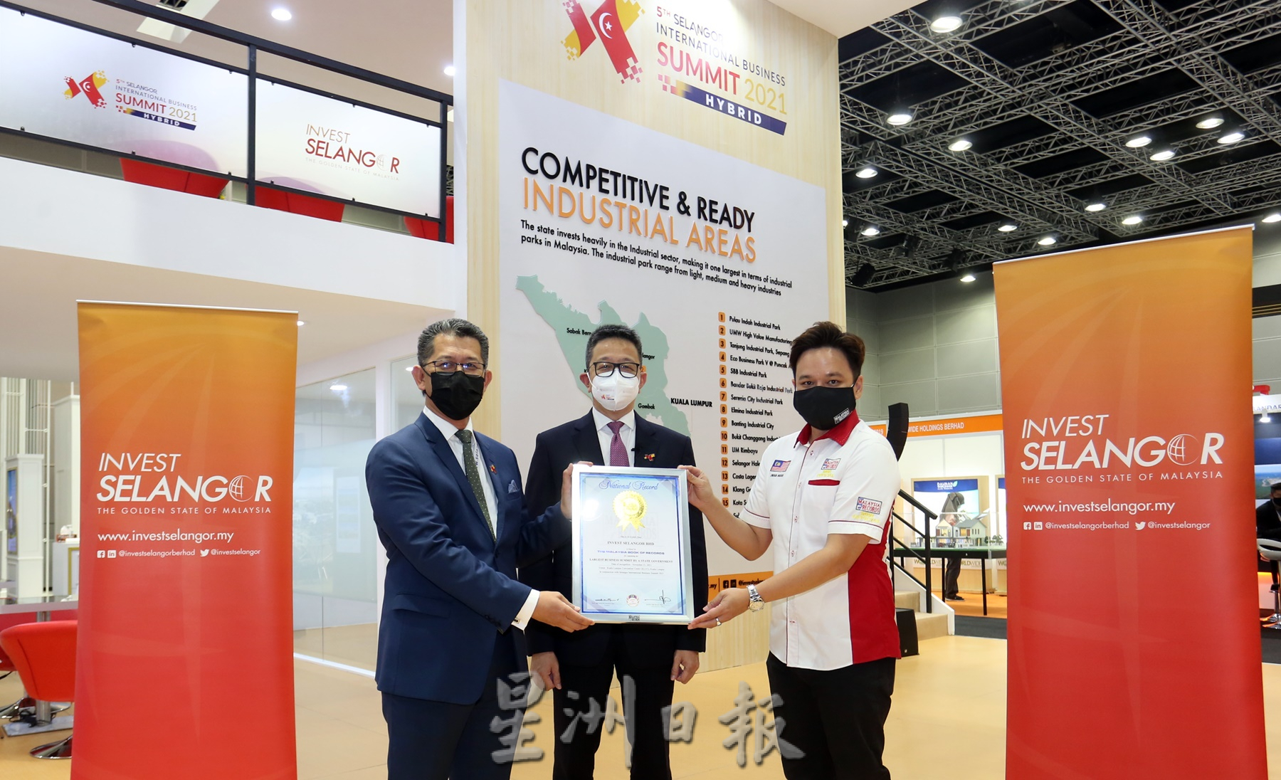 掌管雪州工商、投资及中小型工业事务的雪州行政议员拿督邓章钦与雪兰莪投资促进机构(Invest Selangor)首席执行员拿督哈山今日出席2021雪兰莪国际商务峰会,并从马来西亚纪录大全营销总监连耀辉手中接领大马记录大全证书。