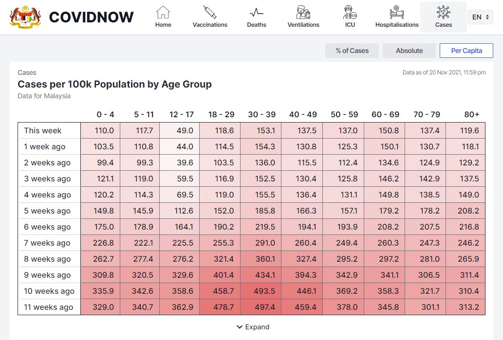 卫生部全国危机准备及应对中心(CPRC)疾病控制组高级首席助理主任马赫阿班南今日在推特帖文表示,COVIDNOW网站将依据年龄层划分更详细的确诊以及死亡数据,并且可追溯过去24周的数据。