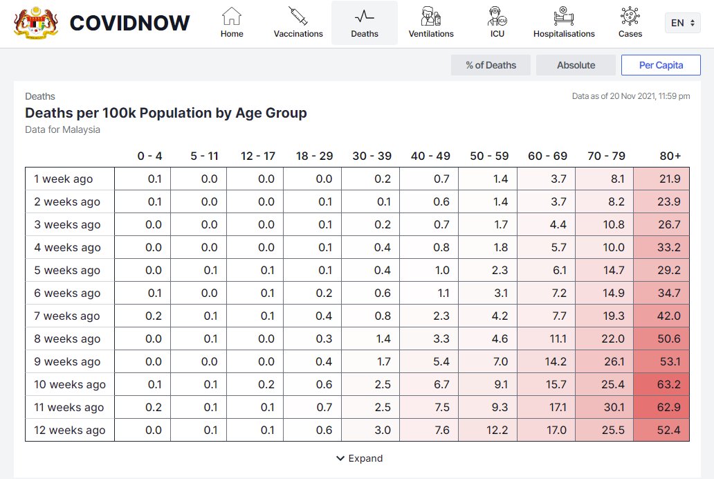 (吉隆坡21日讯)卫生部COVIDNOW网站推出新功能,将按年龄组划分的确诊病例和死亡人数。