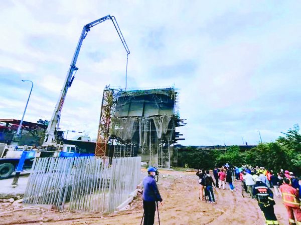 事发当时,工地捷运桥墩运行灌浆作业,5名作业员1人手持灌浆管,4人将从管内输出的混凝土抹平,不料,正灌到桥墩驻头顶板阶段时,1侧顶板突然坍塌,5名作业员闪避不及,4人从高处摔落地面,1人卡在鹰架上。