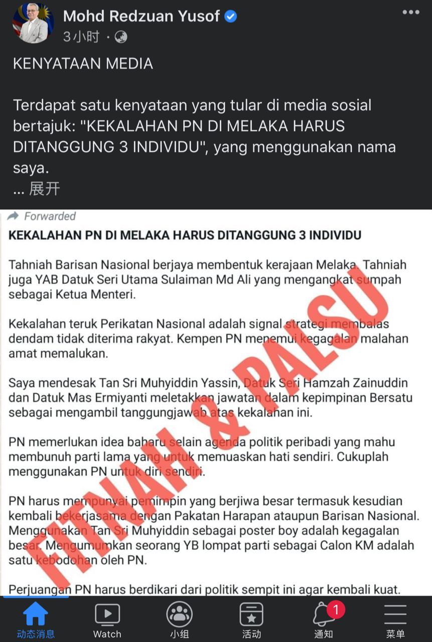 (马六甲21日讯)社交媒体流传以土著团结党亚罗牙也国会议员拿督斯里礼端尤索夫名义发出的“甲州土团党惨败必须由3人负责”的文告,但礼端尤索夫今日严正否认是他发出的文告。
