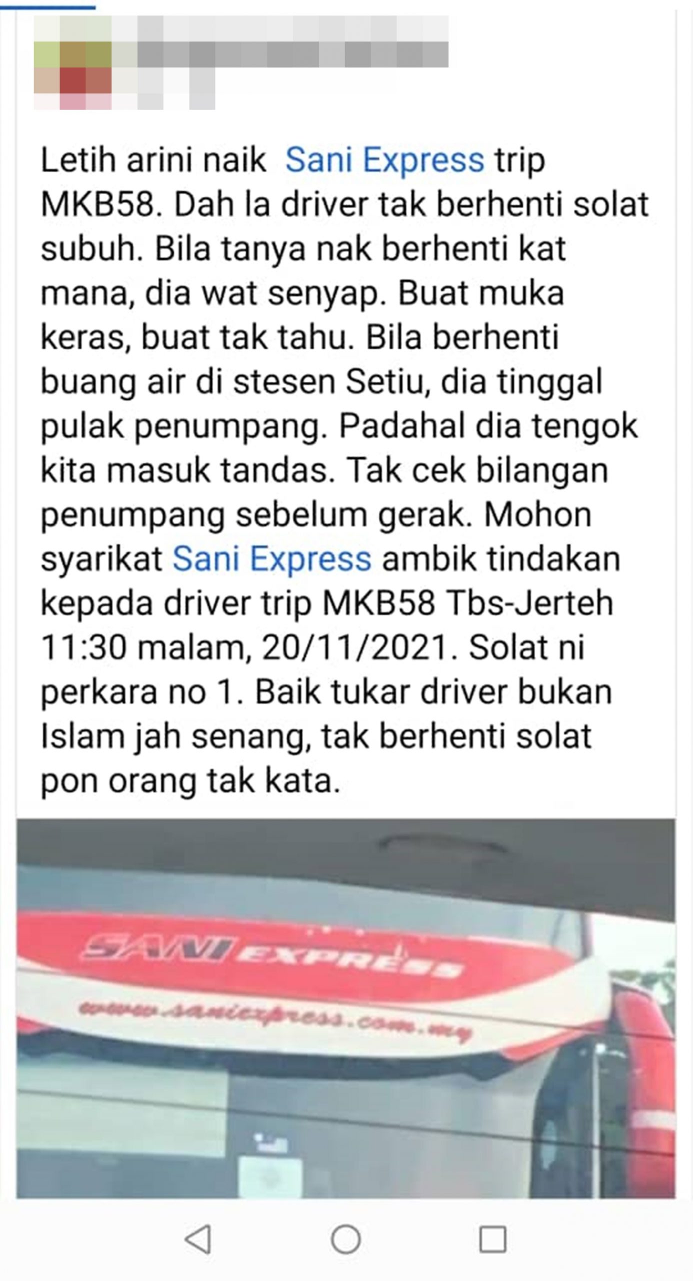 “促请Sani Express针对2021年11月20日晚上11时30分MKB58 Tbs-Jerteh行程的司机采取行动。祈祷是重要事项,更换司机总比改变伊斯兰来得容易,不停止祈祷,人们也不会说什么。”