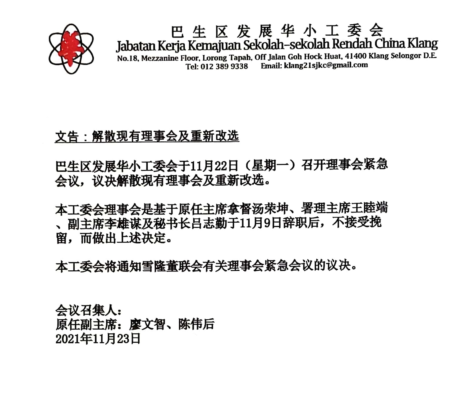 (巴生23日讯)基于主席及另3名领导辞职而不接受挽留,巴生区发展华小工委会议决解散现有理事会及重新改选。