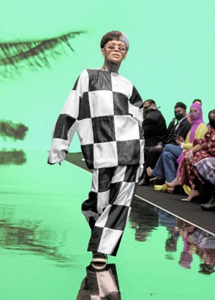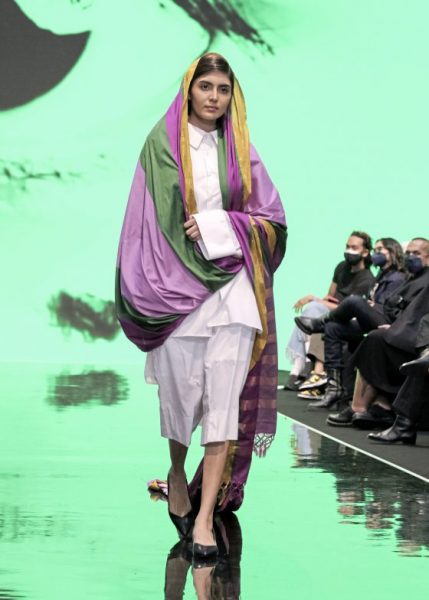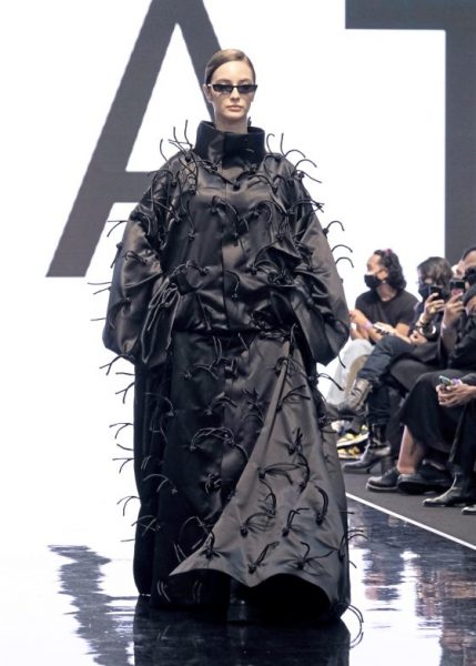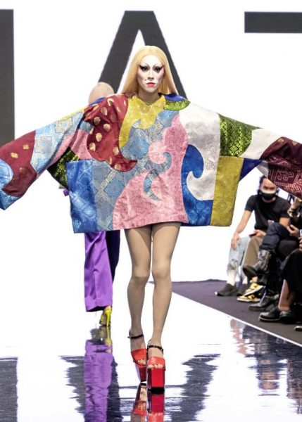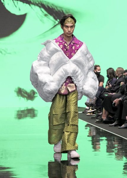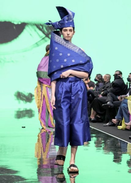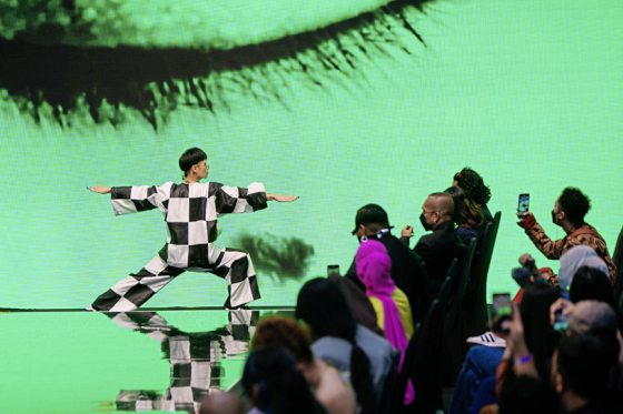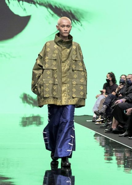 他也用了不一样的方式让新生代感受不一样的传统服饰,包括以传统Songket布料裁制的西装,称作“阴阳”看似简单的黑白方块拼凑服,其实在灯光下间烁了丝缎上的暗花。采用过去多数用来制作中装的花样丝缎以对待丹宁裤的方式,打造成具破损的超酷裤装。巨型的马来武士折帽成了上衣,不仅颠覆了所有传统布料与传统服饰该有的样子,也刷新了人们的视觉欢感。