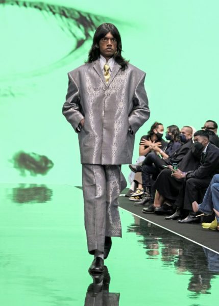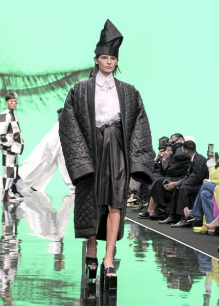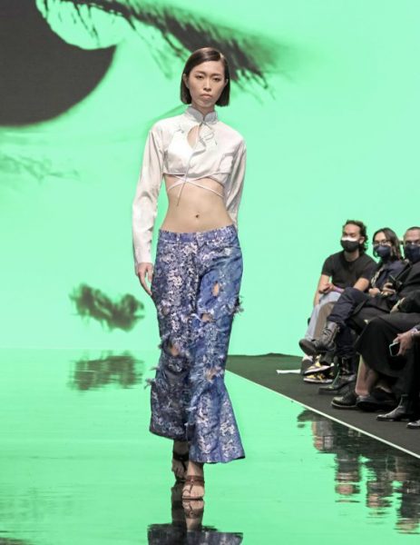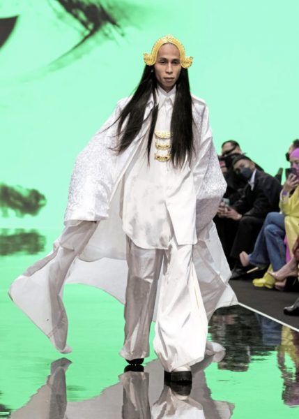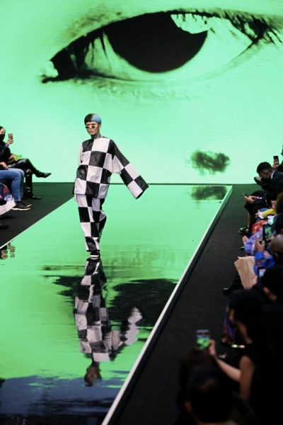 一场秀看下来,若是看得仔细,便能感受到计师投放在这一个系列里所有的细节与用心。除了服装的设计,伸展台背景荧幕上的巨眼,正是设计师Kel Wen的眼睛,寓意他的眼所见到的传统服饰。另外,还有他创作及提前预录演唱的服装秀背景歌曲,让人预见新生代设计师施展的全方位创意理念。