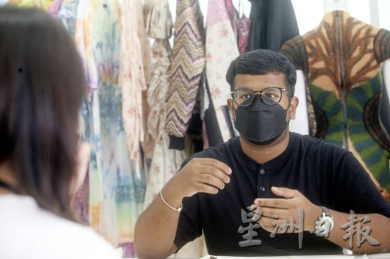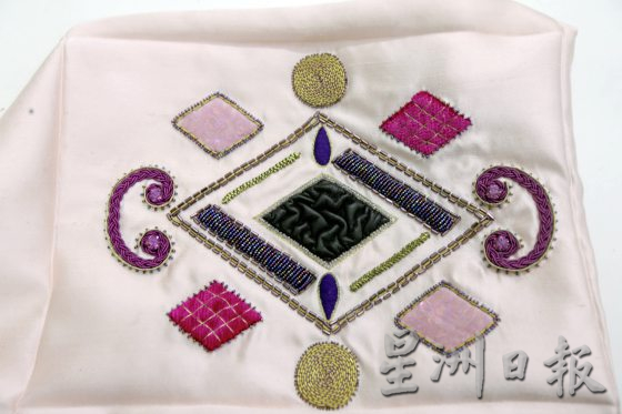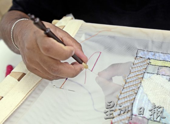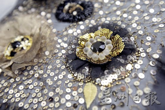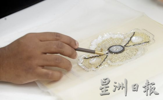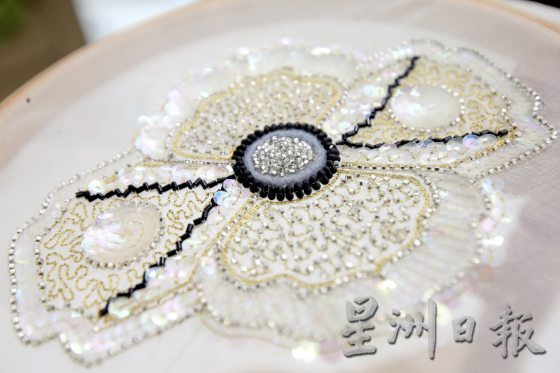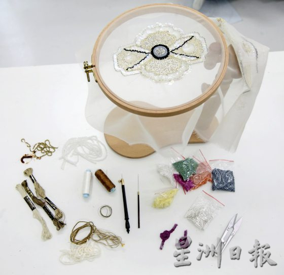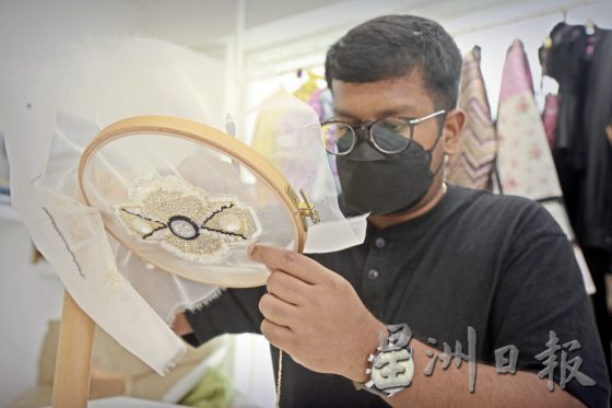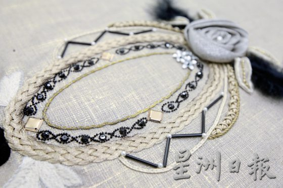 在近两年疫情笼罩的大环境下,他把刺绣的工作从设计转向教学,如今在武吉加里尔的MU Space工作室教授法式刺绣。访问当天,他穿着简单的黑衣黑裤,神情专注地与珠子针线布料打交道,给我们展示法式刺绣的细腻工艺。