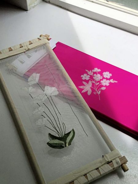问法式刺绣难不难,他拿起勾针说:“关键在于如何掌控这支勾针,很多人尤其是初学者,因为这支针对他们来说是新东西,较难掌握。”不过,只要耐心研究学习,要缝制出简单好看的法绣作品并不是难如登天的事,相反,眼看手中刺绣作品从无到有的感觉,其满足感和愉悦感不言而喻。