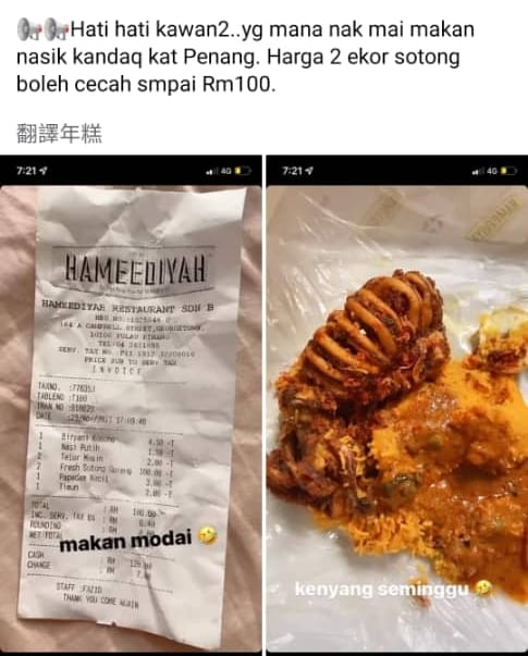 一名网民昨日在脸书揭露,他点了一道“炸鲜苏东”,竟收费100令吉。