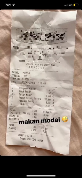 根据他在网上出示的账单,该餐馆的1碗印度香饭收费4令吉50仙、白饭1令吉50仙、2粒咸蛋2令吉、小块印度脆饼3令吉、黄瓜2令吉,而最惊人的是2条炸鲜苏东100令吉。