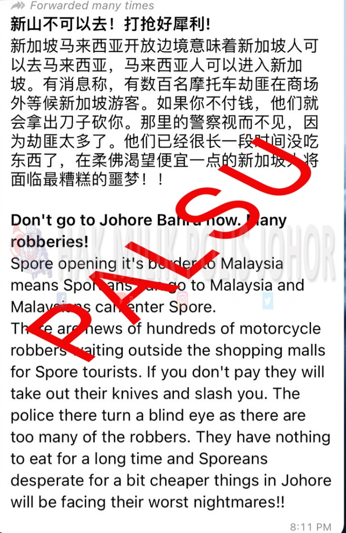 这则社交媒体上流传的不实消息称新山不可以去,打抢案严重,并指数百名摩托车劫匪在商场外等候新加坡游客,如果不付钱,匪徒将掏刀子行凶。