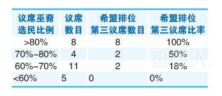 巫裔选民占六到七成的选区,共有11席。当中,也有出现希盟选票排位第三的议席,即是N24万望,以及N25霖区。也就是说,在此种族构成下,只有约二成的选区,希盟排位第三。巫裔选民六成以下的所有选区,则全无希盟选票排位第三的议席。