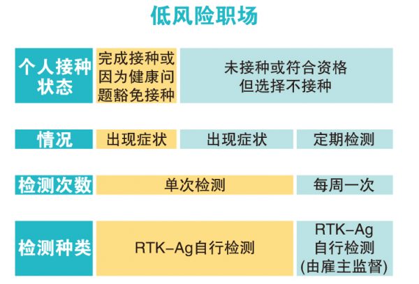 至于在低风险职场,只有未接种疫苗者或符合条件但选择不接种疫苗者,须定期使用快速抗原自行检测试剂盒进行检测,每周一次,检测必须在雇主的监督下进行。