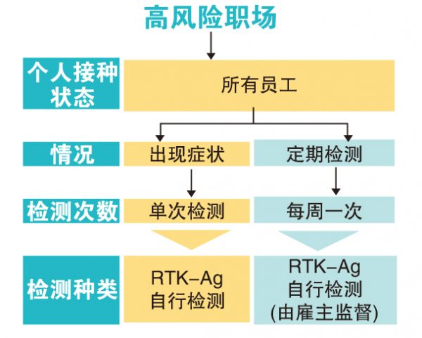 该策略指出,在高风险职场,所有员工,无论是否已经完成疫苗接种,都须定期使用快速抗原(RTK-Ag)自行检测试剂盒进行检测,每周一次,且检测必须是在雇主的监督下进行。