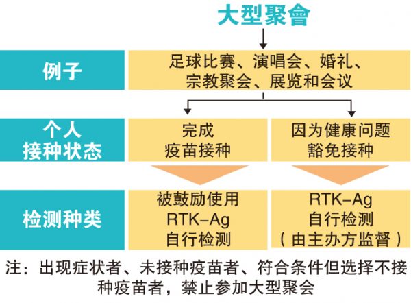因健康问题而无法接种者,则须在大型聚会主办方的监督下,使用快速抗原自行检测试剂盒进行检测。