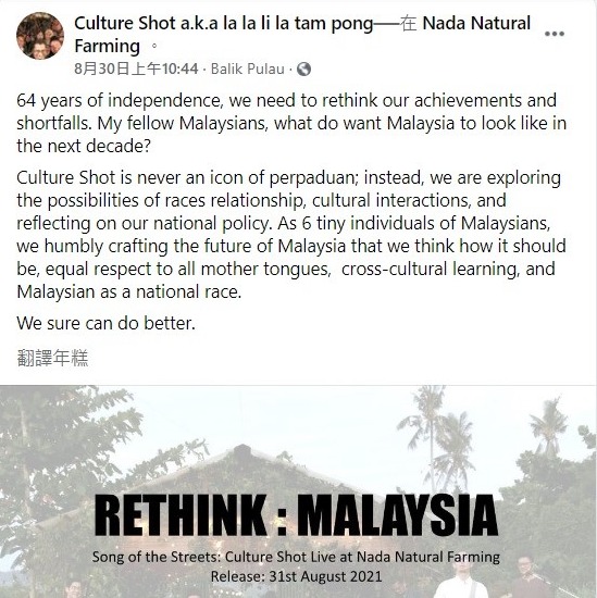 在国庆月,他们抛出“再思考马来西亚”(Rethink:Malaysia)的提问,在脸书贴文表明:Culture Shot从不是团结(perpaduan)的象征。反之,我们正在探索种族关系、文化交流的可能性,并且反思国家政策。作为马来西亚6个微小的个体,我们谦卑地打造心目中的马来西亚,认为它应该是:平等尊重所有母语、跨文化学习,以及大马人作为一个国族。