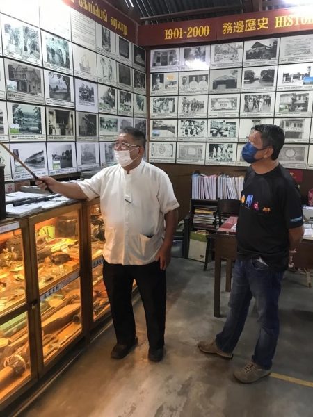 彭老师以宏亮的声音为我们导览讲述过往点滴与老故事。他那一句:“没有锡米就没有务边”,真是触动人心!他指着墙上旧照片逐一介绍:在英国白人的殖民时期,来自中国广东佛山的先贤们是开拓务边镇的先驱。紧接着,来自苏门答腊的曼泰林人(Mandailing)也参与了采锡洗琉琅工作。为了能大量采锡,采矿老板们还花巨资建造15公里长大水管,当时甚至出动大象搬运水管,至今依然为人津津乐道;可惜啊,大水管已经被近代发展给吞噬掉了!