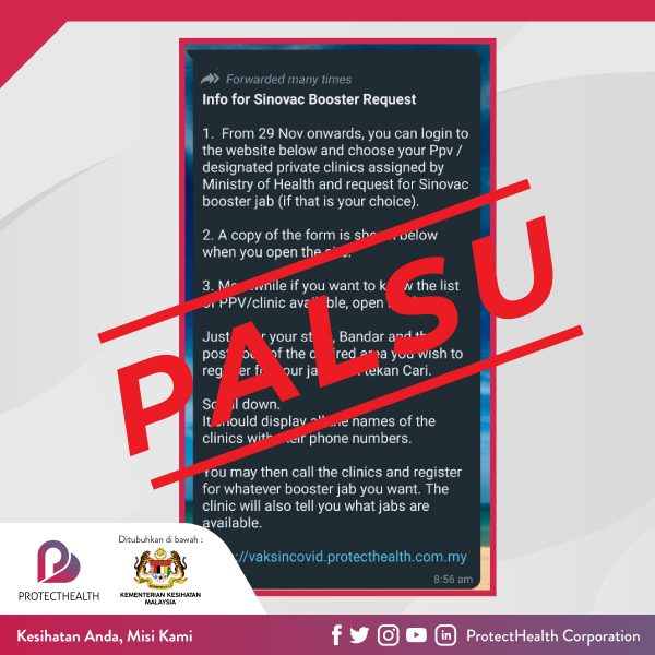 ProtectHealth ingin memaklumkan dan menafikan bahawa terdapat satu mesej yang tular di aplikasi WhatsApp berkenaan pemberian dos penggalak (booster dose) baru-baru ini yang mengatakan masyarakat awam boleh memilih jenis vaksin untuk diterima. pic.twitter.com/hAqr4Lnp0h