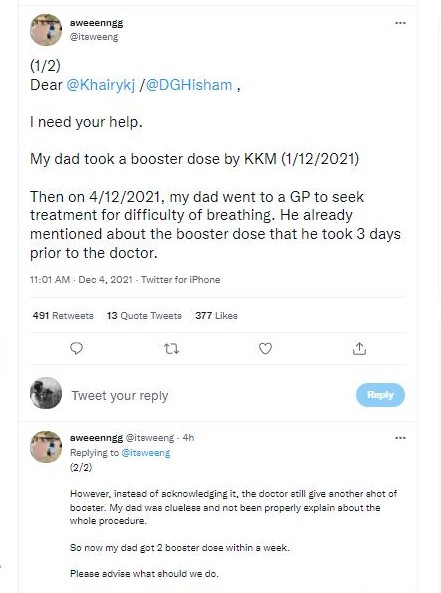(八打灵再也4日讯)一名女子说,其父亲到诊所就医时,医生在得知他已接种加强针的情况下,仍为他再次接种,导致父亲在短短4天内,接种了2剂加强针!