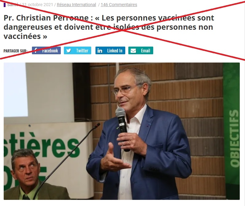 社交媒体流传一则信息,内容称“世界卫生组织欧洲免疫咨询专家组前副总裁克里斯蒂安佩龙教授”表示,“所有已经接种疫苗的人都必须在冬季隔离,否则可能会患上严重疾病,而未接种疫苗的人对他人并不危险”。