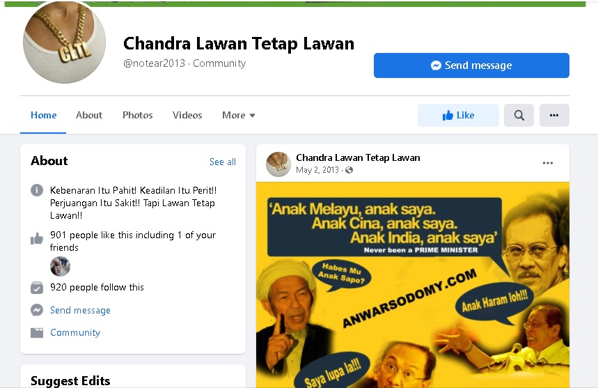 (吉隆坡4日讯)社交媒体流传一张被指是由“Chandra Lawan Tetap Lawan”脸书帐号发布的资讯图,但是该帐号已不活跃于发布贴文,最新的贴文是在2013年5月2日。