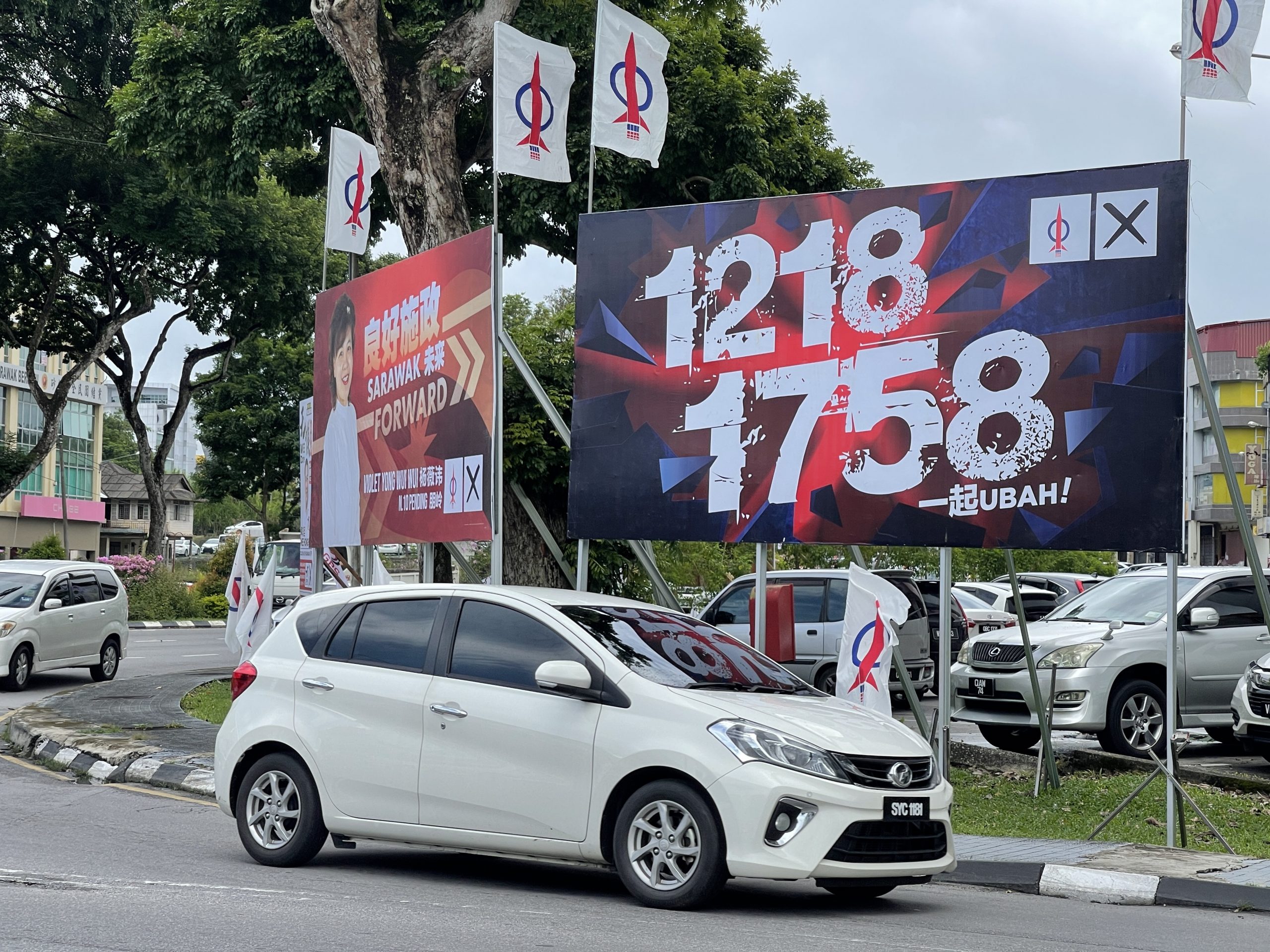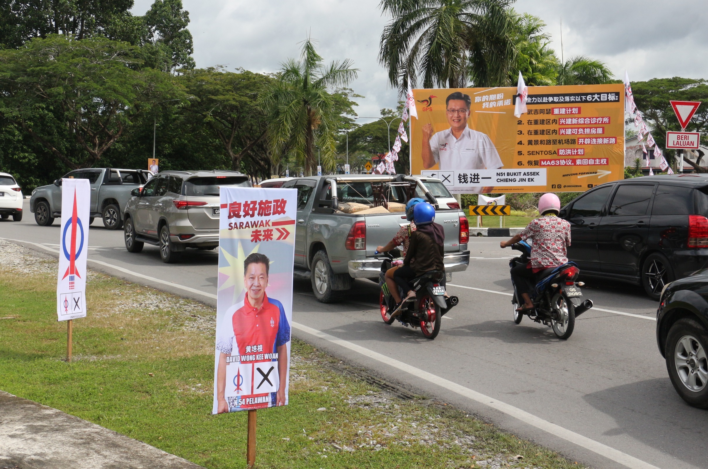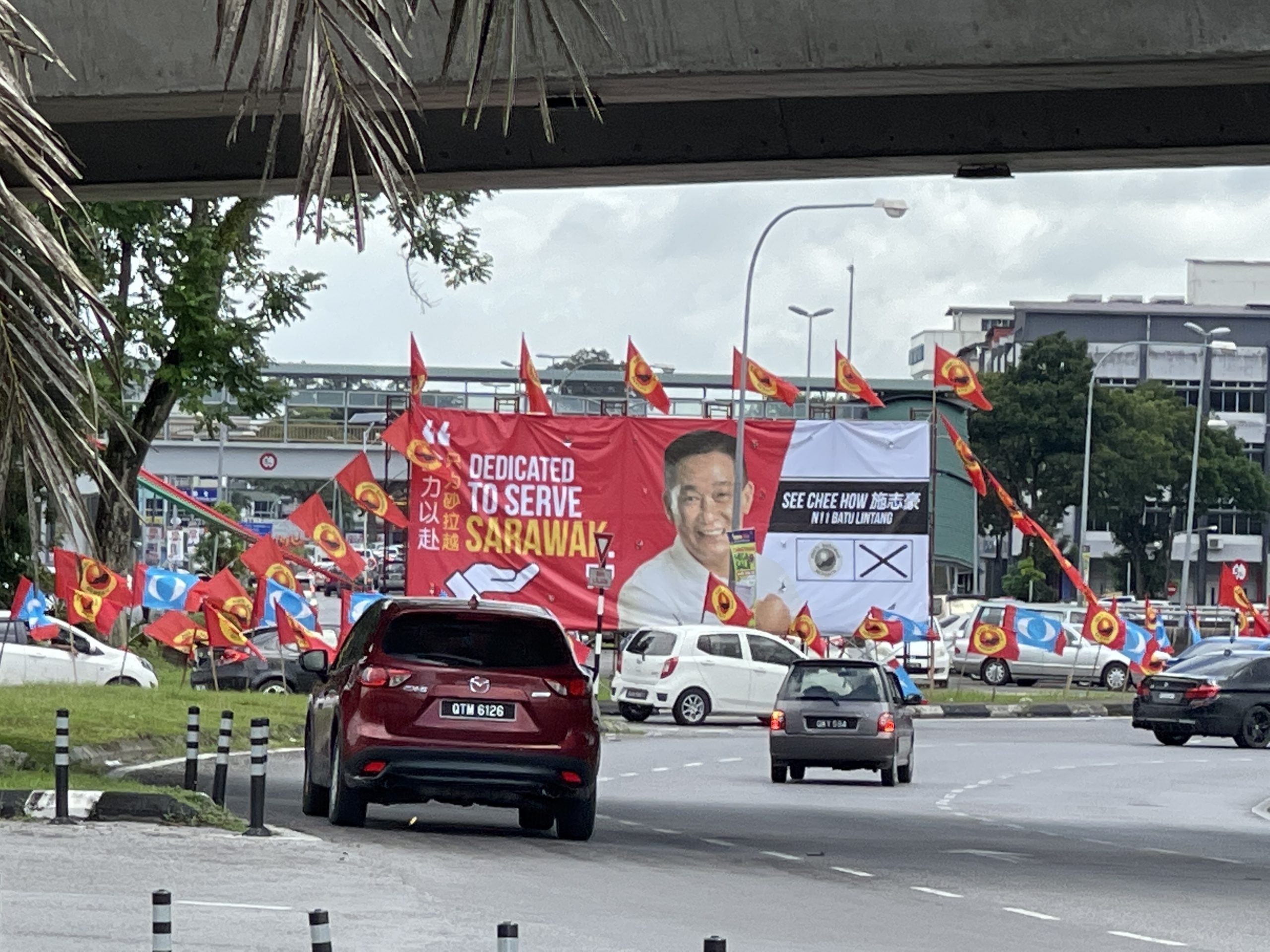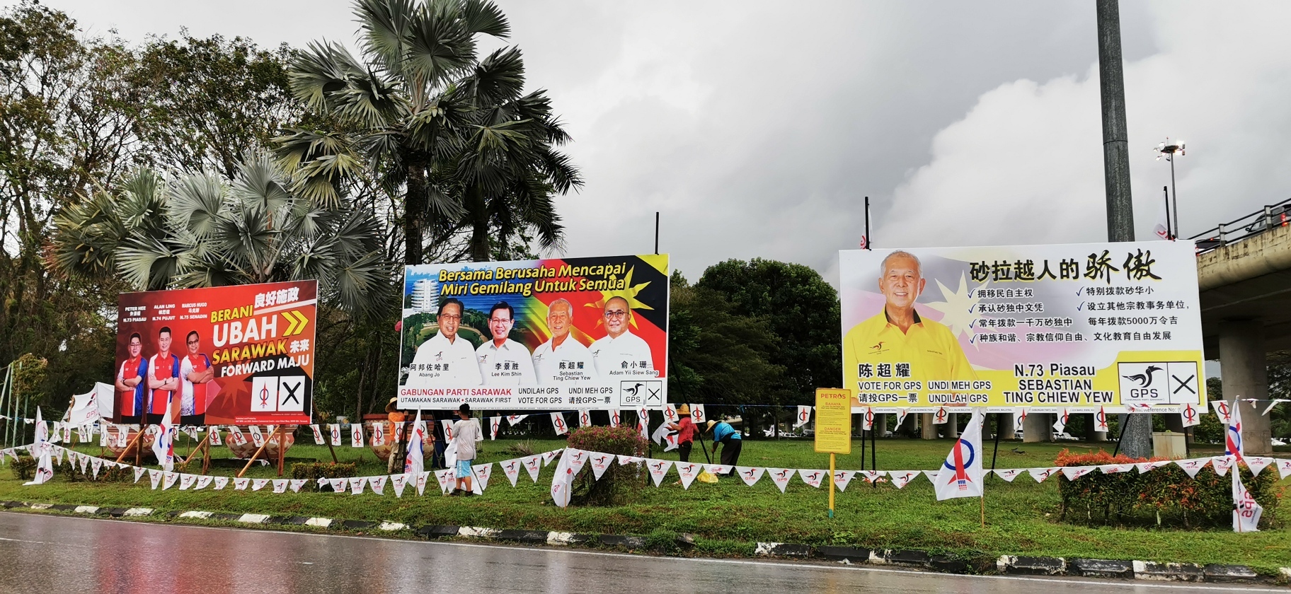 除了砂联盟政党,砂拉越全民团结党、砂肯雅兰全民党及行动党皆不落人后,纷纷竖立起印有候选人肖像的大型看板。