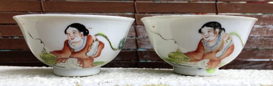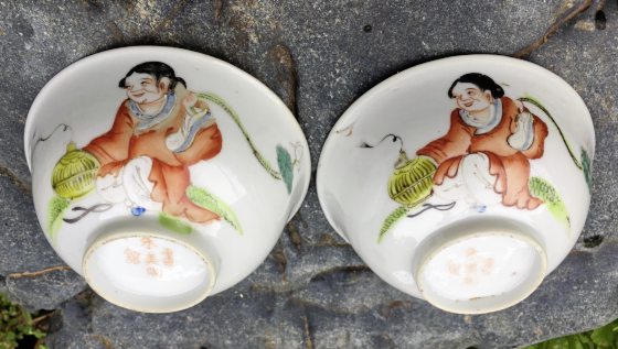昔时,常见于民间用瓷喜以“芭蕉美人”图案,或以“和合二仙”入画,即使近几十年来的厨房器皿,比如杯碗盘碟,算是惯见平常之物,一点也不稀奇。廿几年前,伪光头佬偶然间于恩达广场的某某茶店,意外地发现乙对小巧可人的和合二仙小碗,画工细腻,古朴动人,品相完好;和合二仙者,实乃寒山与拾得为本尊,禅和子是也,但见一子持盒(合之谐音),但见象征福气的蝙蝠从中飘然飞出,另一子则持荷花(和之谐音),碗背题有“千和万合” ,寓意甚佳;碗底款识,以朱红釉题上“朱美陶画馆”5字款,瓷胎温润,乃典型的民国时期尤物,让人一见倾心。惟索价稍微偏高,缘于初登雅玩之场,不计成本,以千金难买心头好之虞,迄今无怨无悔,依然爱之如初。
