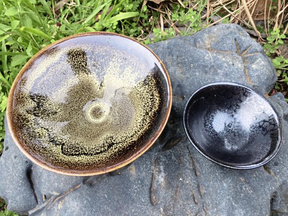 寒舍藏有两只不知年的日本天目茶盏旧物,带款小盏呈黑釉色,隐隐约约中,可见墨绿色斑点,宛如苍穹中之繁星闪烁,密密麻麻的布满釉面;另外一只稍微大的,则为褐釉色,上口宽大而足圈窄小,造型独特,油滴窑变而呈现的幻化似的图案,细密如毫,令观者目眩神驰,为之叹息!此二物乃薇斋老人昔年馈赠留念之物,故珍而惜之,屡屡感念老人之厚爱,铭感五中。睹物思人哉,思念之情与日俱增,伤悲切!
