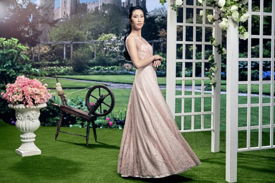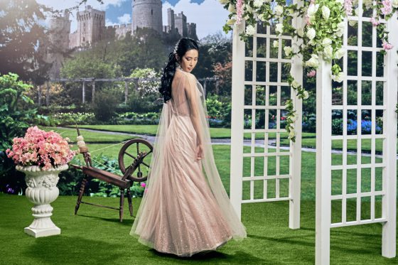 提到Aurora公主,一时让人想不起她到底出现在哪一部Disney公主系列的电影中,她可是1959年上映的电影《睡美人》的主角。设计师Celest Thoi衍用了她在电影中轻柔的粉红色调,打造了一件格外甜美、极具女人味的礼服,而且更细心的加设了同色的透纱披肩,可以有不同的造型。