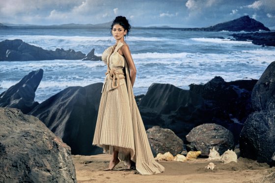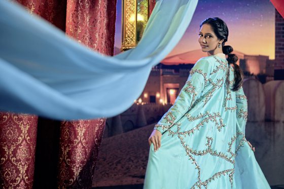 设计师Alia Bastamam自《Pocahontas风中奇缘》取得灵感而设的米色礼服,在肩带及裙子的流苏设计上,以孔雀绿色、金色、水绿色的水晶作为设计,与电影中Pocahontas的孔雀绿色项链相映。轻盈飘逸的礼服材质,则是从剧中歌曲〈Colors of the Wind风之色彩〉得到灵感完成的特点设计,让人见到一展华贵的Pocahontas公主。