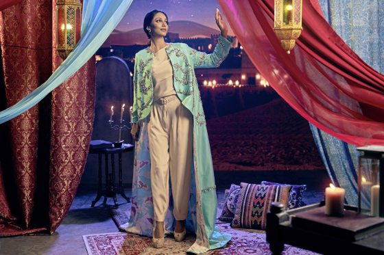 设计师Nurul Zulkifli为Jasmine保留了原有的裤装造型,不过却换上了米色系。电影中的水蓝则应用于长袍外套上。这件可作为日间与晚宴造型的外袍,内里采用的是设计师品牌Mimpikita经典的花样巾料,外侧则是钉珠缀饰的花样设计,展现了低调华丽风情。