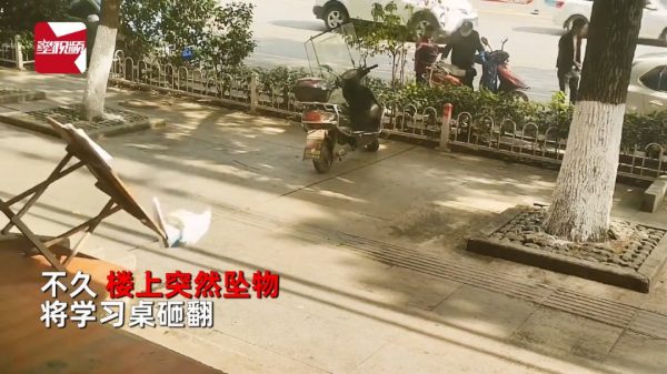 中国湖北阳新一名男童因离开座位搀扶摔倒的路人,竟意外躲过高空抛物事故,没有受伤。
