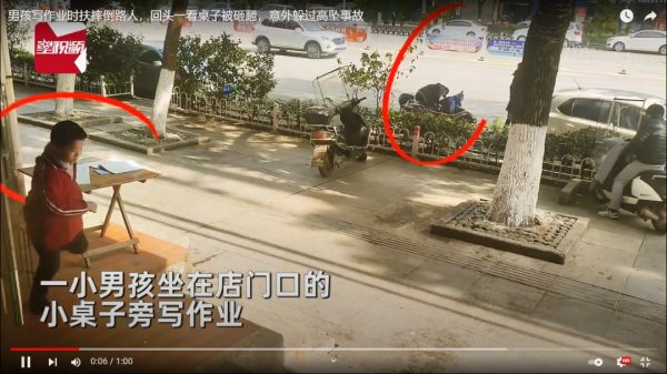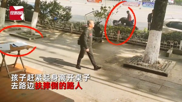 乐姓男童上周六(4日)坐在店门口的小桌子旁写作业,监控画面可见路旁一名男子骑摩托车摔倒,男童见状立即起身趋前,去路边搀扶该名摔倒的路人。