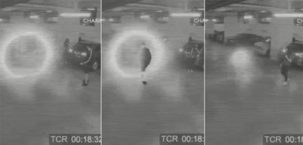 监控画面可见这对男女驱车缓缓驶入停车场,正当泊车时路中央就出现一个魔法光圈,且越变越大。直至这对男女走下车时,发现该神秘光圈已经成型得可容下一个成人的大小。