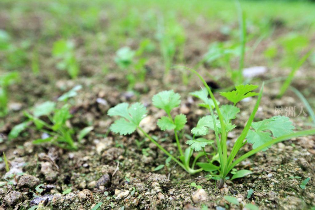 他领我们到菜圃看看,香菜苗大约就是手指般的长度,一旁的野草比它们还要高,但小扇形花式的叶片已经张开,若长满一堆,真的尤如满天星般浪漫。难怪,香菜(芫荽)又被称作满天星。