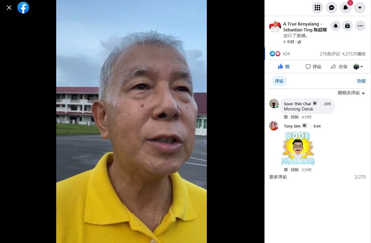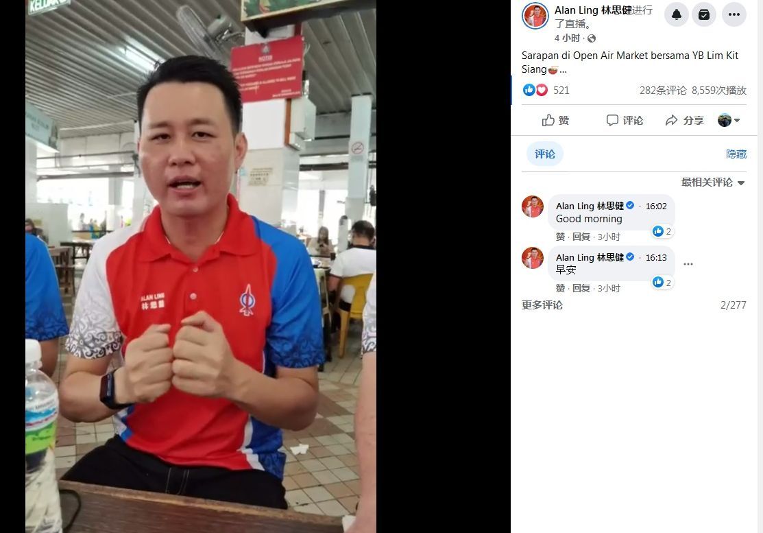 史纳汀砂盟人联党候选人拿督斯里李景胜通过脸书直播分享他走入选区处理民生问题,让选民清楚知道他的动态。
