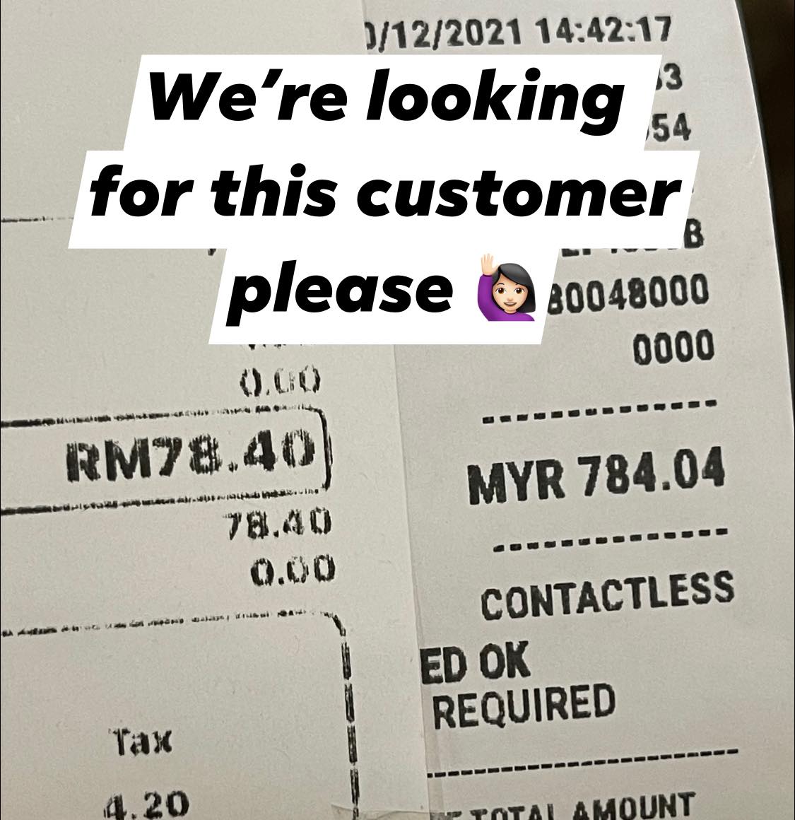 餐厅呼吁网民帮忙转发贴文,以便能尽早找到该名顾客。