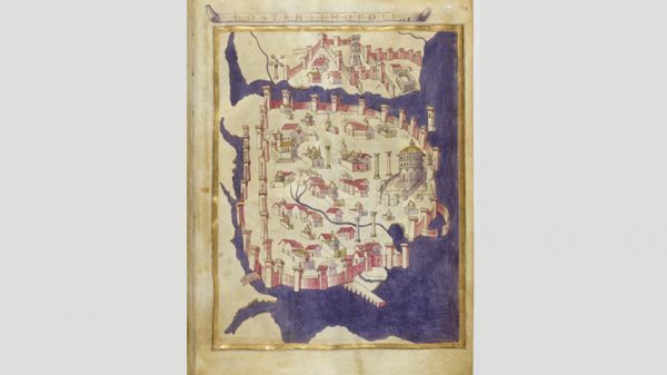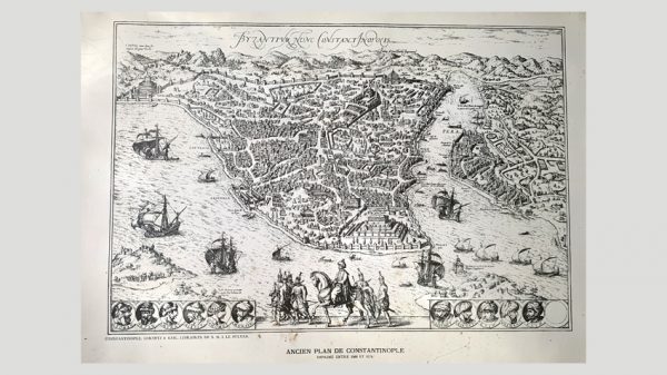 于是开始翻书找过去发生的事。东罗马竟然就是拜占庭,也就是唐代里提到的拂菻(啊如果你有看“武媚娘传奇”你就懂那把扇,不过我没看)。转个身,原来也是厨房里那只珐瑯锅的珐瑯啊。客厅里一直摆着君士坦丁堡旧日地图,十多年放着也不曾仔细看。把这城市搬出来,仔细瞧瞧。黑白细细线条画的屋子,窗口和围墙,船只和骑马的人。也有个教堂。我喜欢这种鸟瞰一座城市的图。从远处看的城市,总觉得更有魅力。即使我从来不住那里,却好像也能在巷子里行走,也能去市集买菜,去教堂把自己交托给神明一般(姑且先不论是哪一位/哪几位神明)。