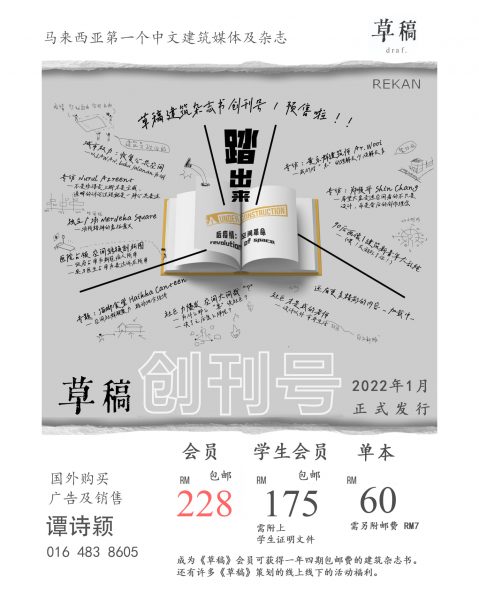由本地中文建筑教育媒体草稿出版的马来西亚第一本建筑杂志《草稿:踏出来》,11月份开始预购,将于2022年1月全国发行。草稿由一群受东西方建筑教育的青年组成,执行总编张国强毕业于清华大学和诺丁汉大学建筑系;执行主编何凯晶则是清华大学EPMA建筑硕士。顾问导师也包括本地知名建筑学者张集强,以及新加坡的英殖民建筑研究者赖启健。
