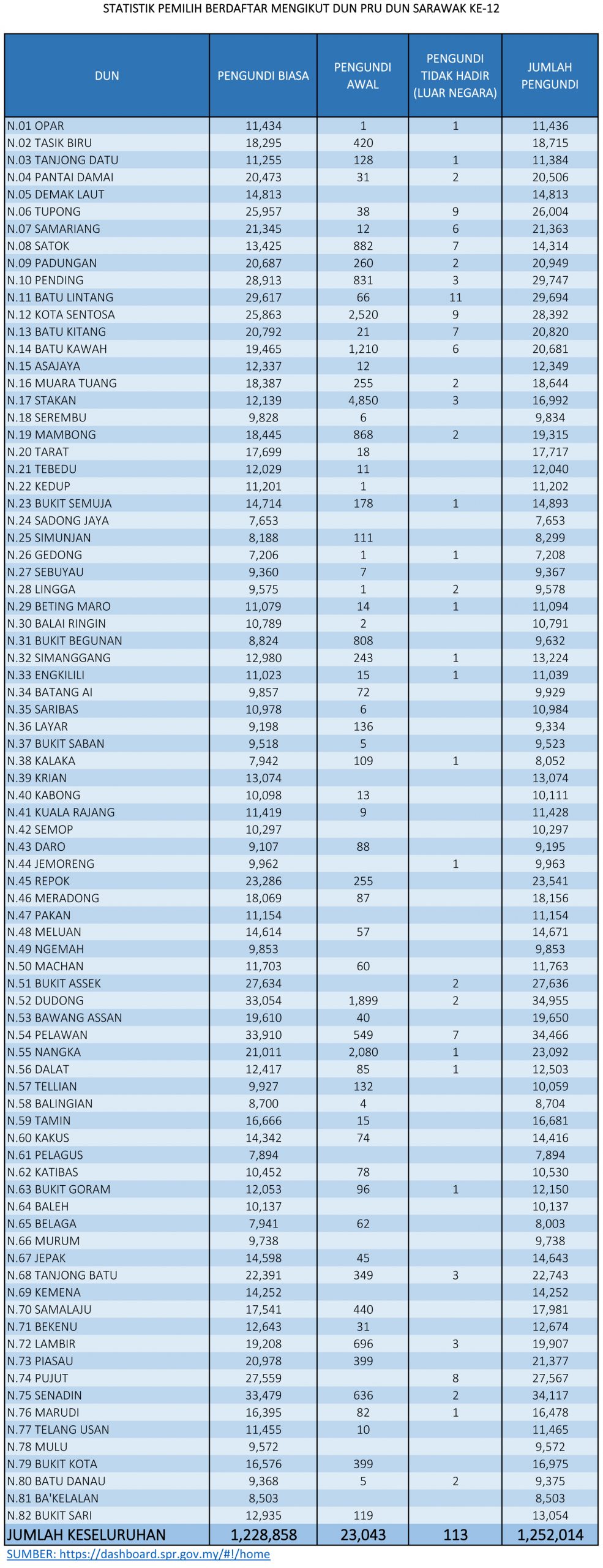 砂拉越有125万2014名合格选民,其中普通选民122万8858人,提前投票选民有2万3043人,以及113人不能出席(外国)的选民。