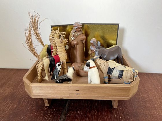 有一个马槽是我用收集各种不同风格和材质的小玩偶,拼凑成一个感觉有点怪异的马槽,为了凸显圣家的地位而摆放一个超小的日式金屏风在后方,底座是一个日本杉木盒,包围在婴孩耶稣四周,都是有点不相干的动物们,包括以干茅草和枝叶编制的马匹和牛,白瓷小狗二只(其中一只好像是某唱片公司的吉祥物),塑胶企鹅和驴子也都赶来凑热闹。