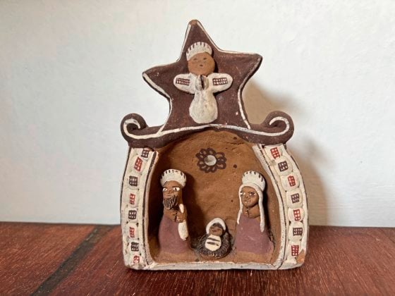 另一个出处不明的粗陶手捏马槽,整体上偏大地色系,造型同样非常淳朴且带有中东色彩,上端胖胖的星星中间飘浮着一个圆脸天使,圣家成员都眼睛大大的,圣若瑟蓄着大大的胡子,圣母玛丽亚表情十分丰富,婴孩耶稣被裹上白色的襁褓,在他们的头上都有一个小小如碟子的光环。